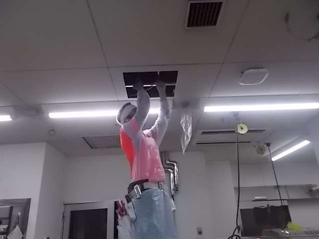 作業中は、こんな感じで、全身をビニールの防護服で、